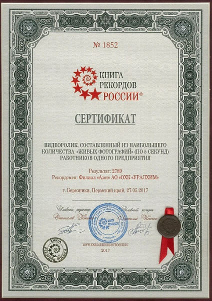 Предприятие вошло в «Книгу рекордов России» благодаря уникальному медиапроекту «Главные люди «Азота», в съемках которого приняли участие буквально все сотрудники, работающие на благо завода, а это 2 789 человек.