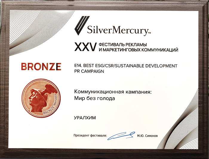 Международная коммуникационная кампания в поддержку инициатив Группы «Уралхим», направленных на преодоление глобального продовольственного кризиса, получила бронзу в номинации «Лучшая PR-кампания в рамках ESG/КСО/устойчивого развития» XXV фестиваля рекламы и маркетинговых коммуникаций Silver Mercury. Фестиваль прошел в Москве с 29 по 31 мая.