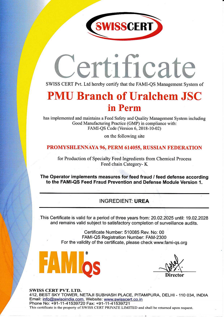 «Уралхим» разработал и внедрил систему менеджмента качества, гарантирующую безопасность, качество и использование лучших мировых практик в области производства кормовых ингредиентов. Сертификат FAMI-QS, выданный международным органом, подтверждает, что предприятие реализует и поддерживает надлежащую производственную практику (GMP).